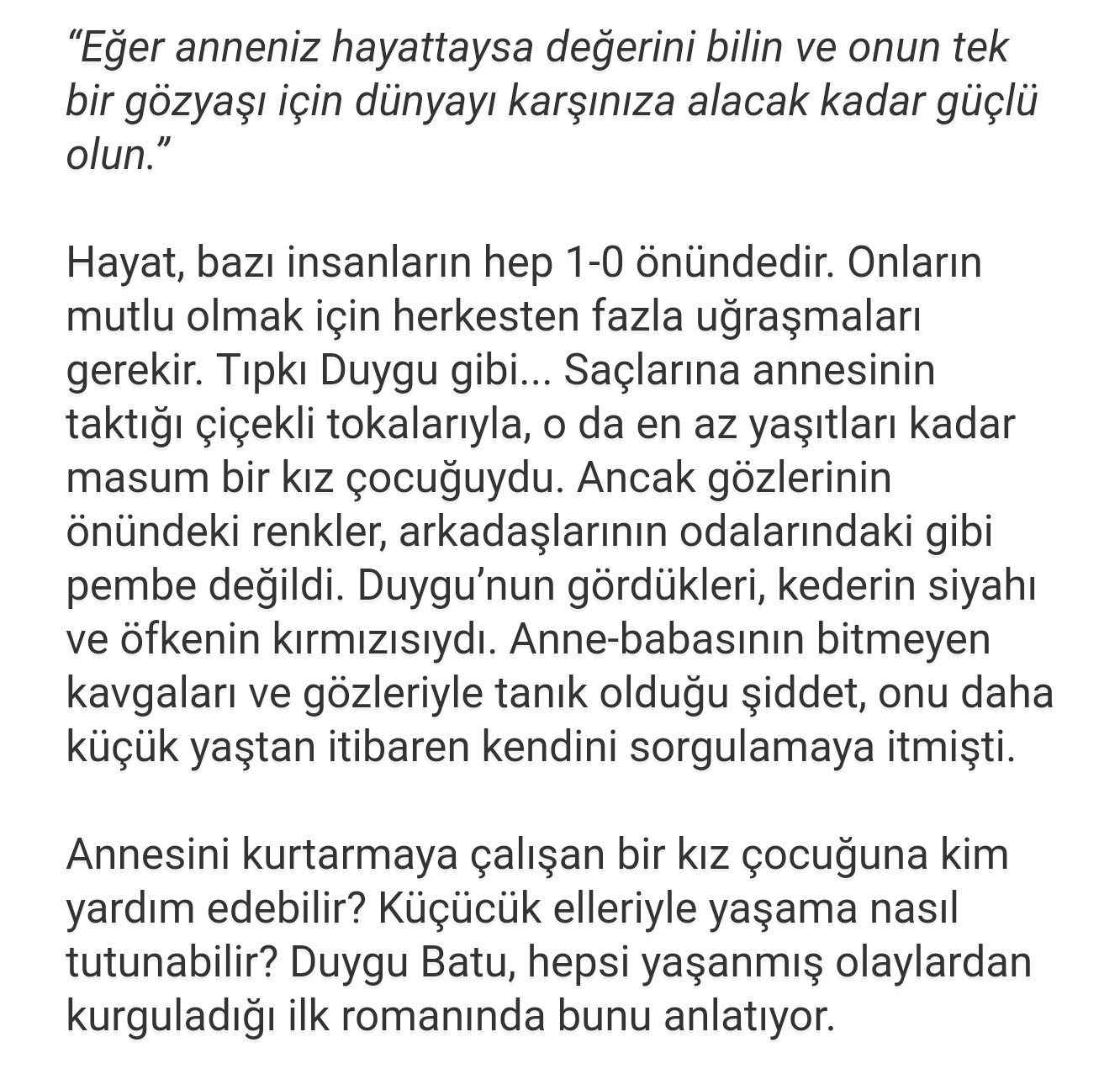 Duygu batu edebiyat roman kategorilerinde eserler yazmış bir yazardır. Hoşça kal anne mona duygu batu eğer anneniz hayattaysa değerini bilin ve onun tek bir gözyaşı için dünyayı karşınıza alacak kadar gü.