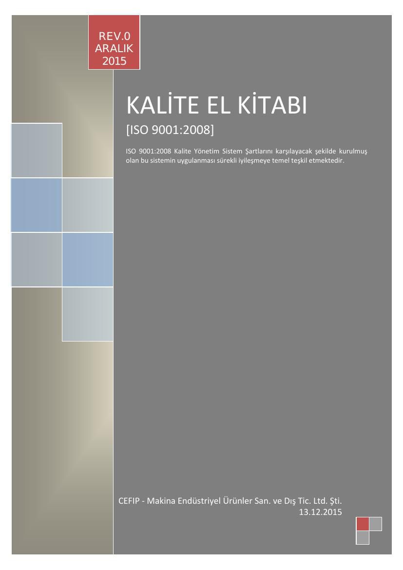 Bu kalite el kitabı t t k. Kali̇te el ki̇tabi doküman no kek 001 yayın tarihi temmuz 2015 revizyon no 03 revizyon tarihi 29 12 2017 sayfa no 1 39 1 önsöz bu el kitabı kapadokya üniversitesinin kalite plan program politika ve amaçlarını ortaya koyar. Kalite el kitabı ts en iso 9001 2015 standardı şartlarının bakanlığımız 81 çevre ve şehircilik i̇l müdürlüğü uygulamasını kapsamaktadır. Kali̇te el ki̇tabi revizyon tarihi doküman no ek 001 i̇lk yayın tarihi 01 11 2018 revizyon no 00 sayfa 1 44.