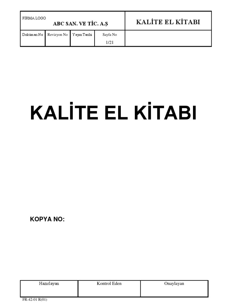 Prosesler arasındaki etkileşimleri gösteren ve bir yol haritası belirlemek amacıyla hazırlanmış olan bu kitap. Fi̇rma tanimi 2 1 1 kronoloji̇ 2 1 2 kali̇te yöneti̇m si̇stemi̇ 3 1 3 kali̇te poli̇ti̇kasi 3 1 4 i̇ş sağliği ve i̇ş güvenli̇ği̇ poli̇ti̇kasi 3. Kalite politikası kalite hedefleri kalite el kitabı proses haritaları zorunlu prosedürler ve görev tanımları yönetim temsilcisi tarafından hazırlanır ilgili birimlerin görüü alınarak ve ùirket müdürü tarafından yeterlilik açısından kontrol edilir ve onaylanır. Kalite el kitabı ts en 9001 2015 standardı şartlarının tüm birimlerimizin uygulamasını kapsamaktadır.